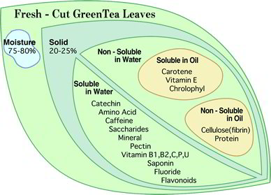 Minerals: Green tea contains 5-7% minerals (ash content). Major types of minerals are kalium, calcium, phosphorus, manganese, zinc, and copper. Zinc and copper are necessary elements in the formation of antioxidants.